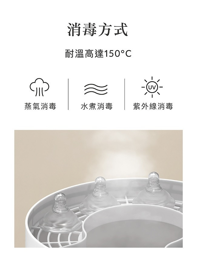 ●耐高溫達150°C,可蒸氣消毒、水煮消毒、紫外線消毒。