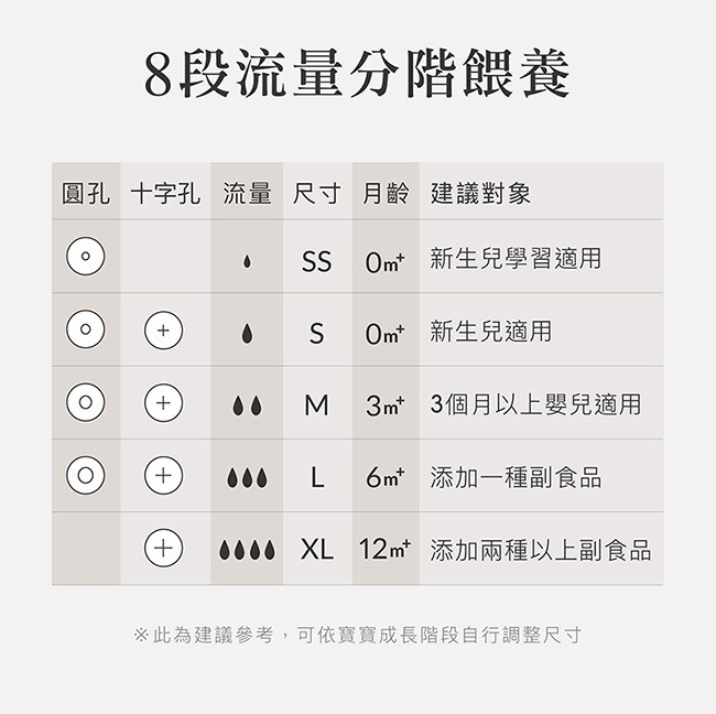 ●防脹氣奶嘴尺寸業界規格最齊全,8段流量分階餵養。