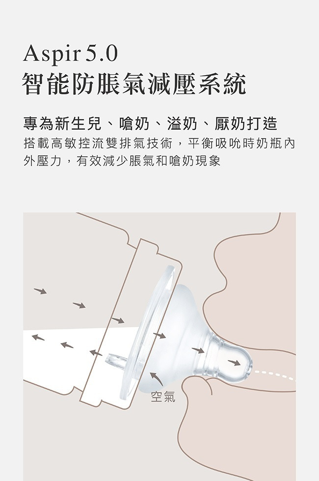●Aspir5.0智能防脹氣減壓系統,防嗆奶、防溢奶、防脹氣。