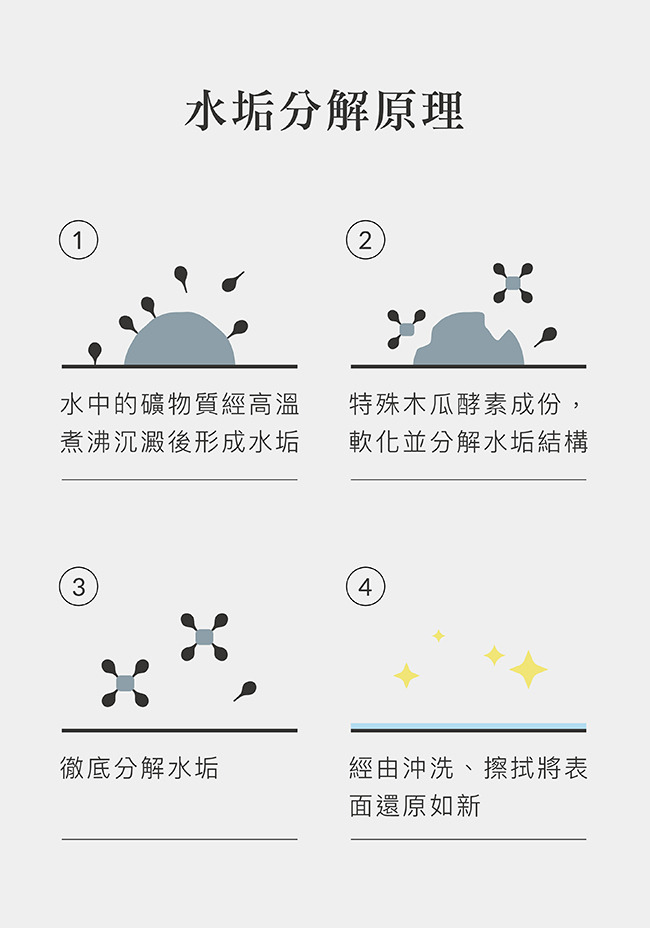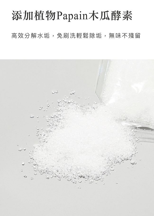添加植物Papain木瓜酵素,高效分解水垢,無味不殘留。