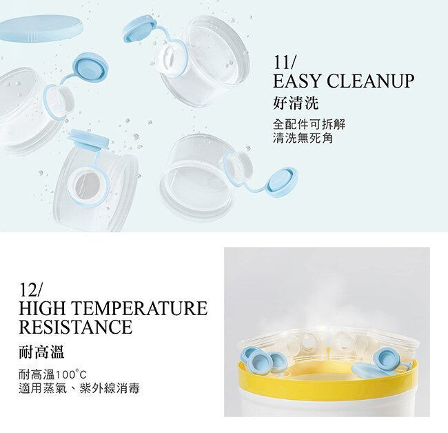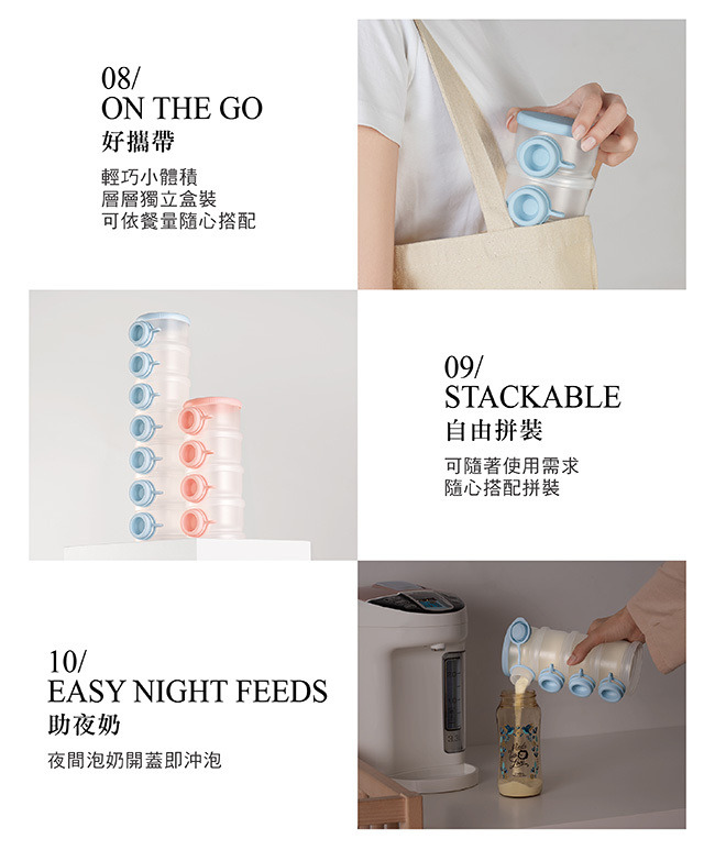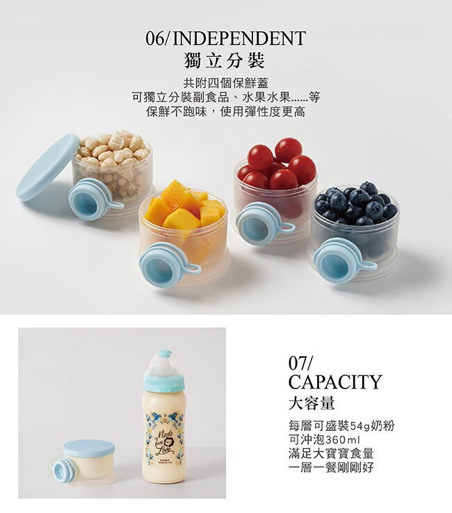 ●每格約54g奶粉量(1匙=約4.5g,可裝12匙)可沖泡360ml奶水量。