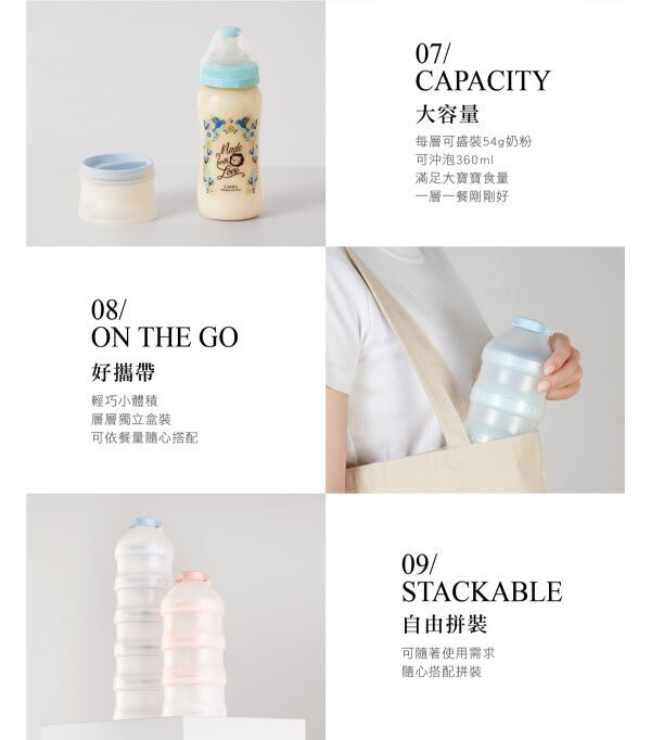 ●每格容量約54g奶粉量(1匙=約4.5g,可裝12匙)可沖泡360ml奶水量或米粥水120g。