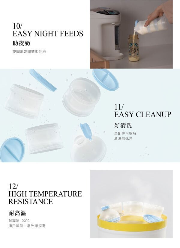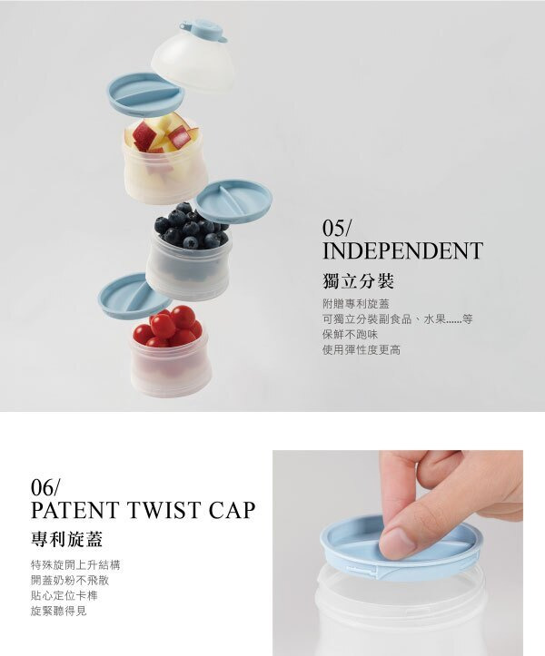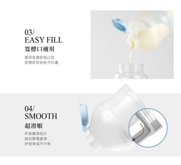 ●貼心定位卡榫與滑軌設計,輕鬆旋開防止奶粉飄散。