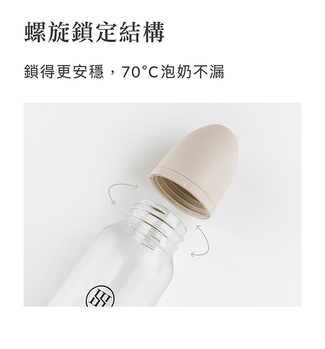 ●螺旋鎖定防漏結構,世界衛生組織WHO建議泡奶溫度70°C也不漏奶。
