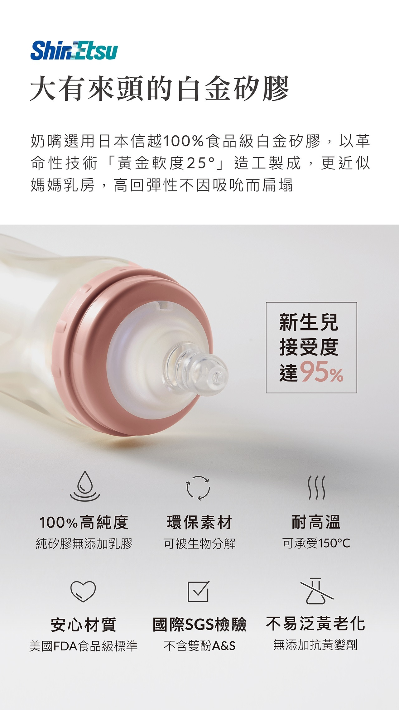 業界唯一每批奶瓶瓶身經國際權威SGS嚴格檢驗,不含雙酚A&S、塑化劑。