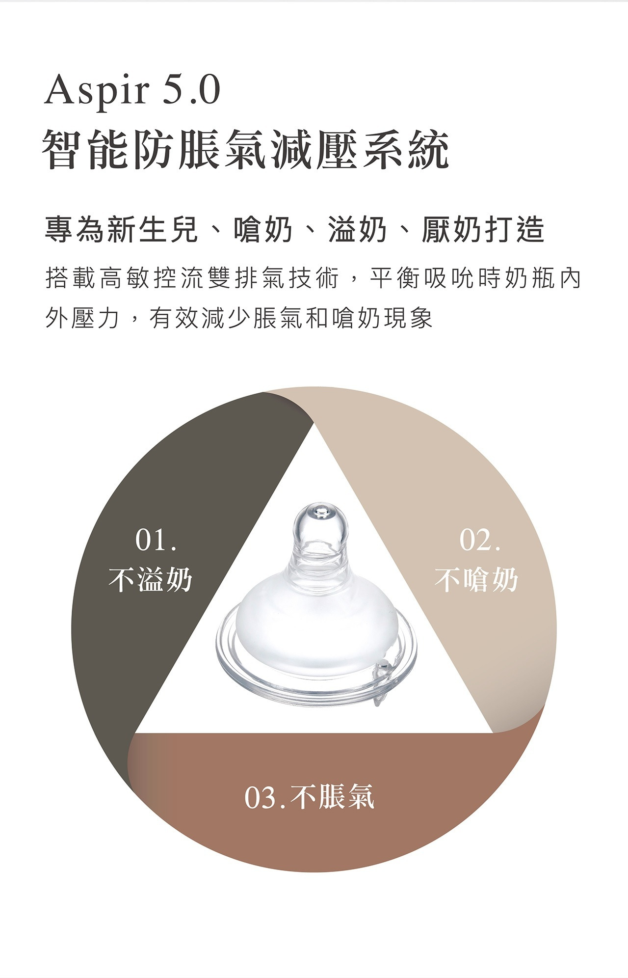 Aspir5.0智能防脹氣減壓系統,防嗆奶、防溢奶、防脹氣。