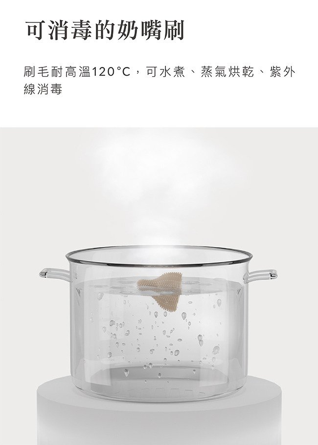 ●刷毛耐高溫120˚C,可水煮、蒸氣烘乾、紫外線消毒。