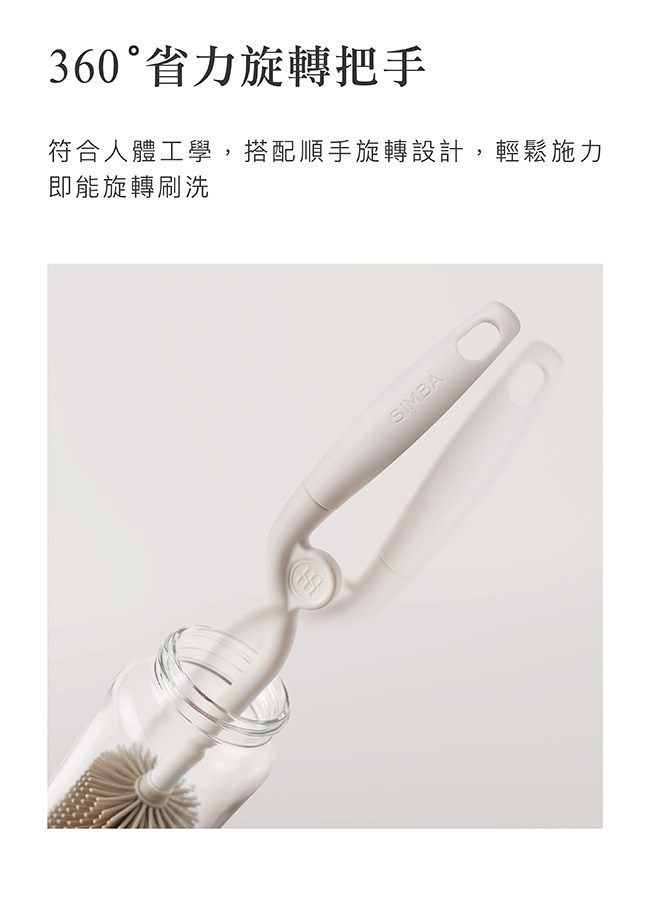 ●零死角貼合瓶身,輕易將奶瓶內側與瓶底清潔乾淨。