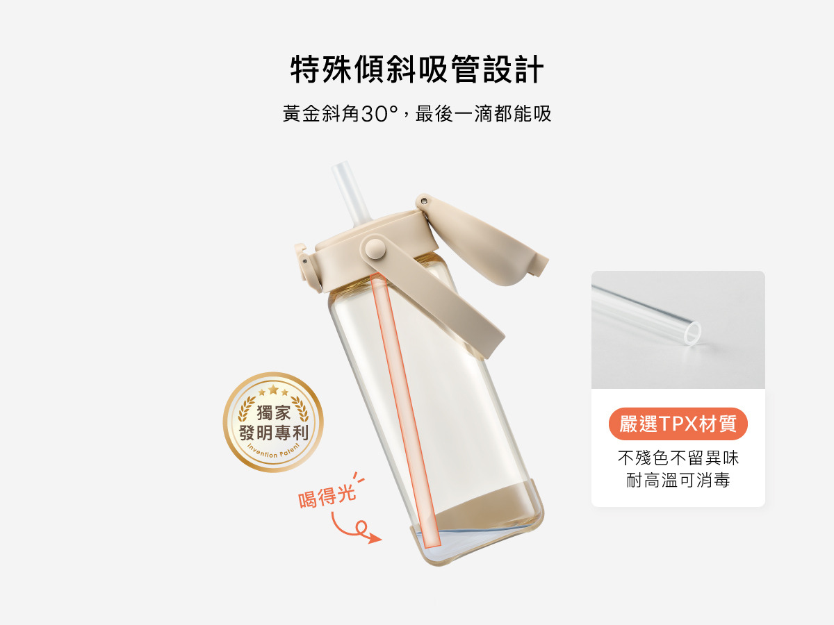 ●獨家發明專利傾斜吸管設計,最後一滴都能吸。