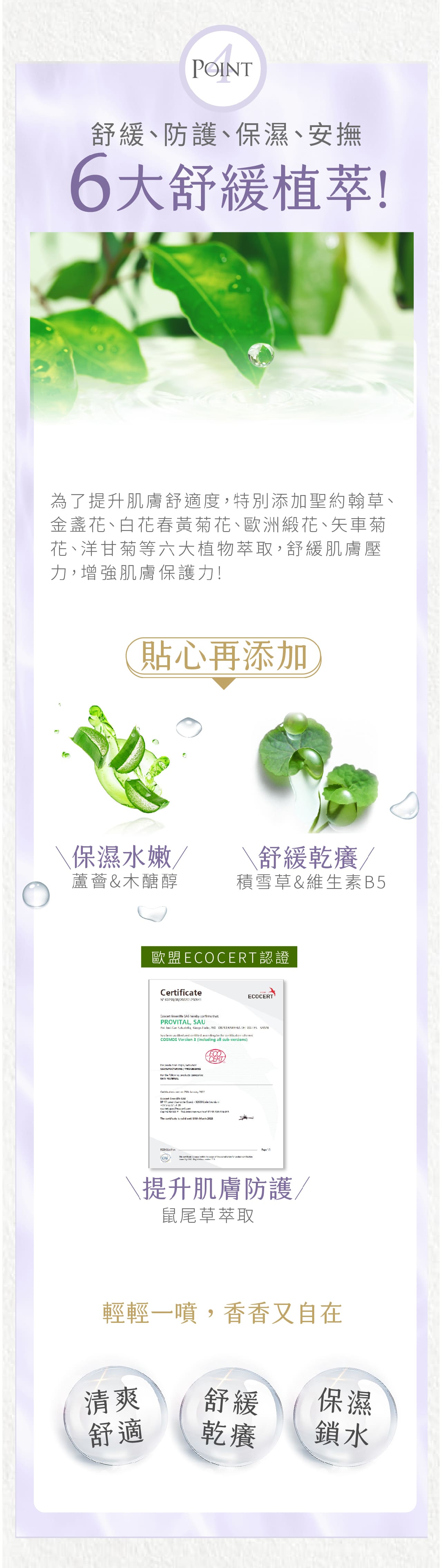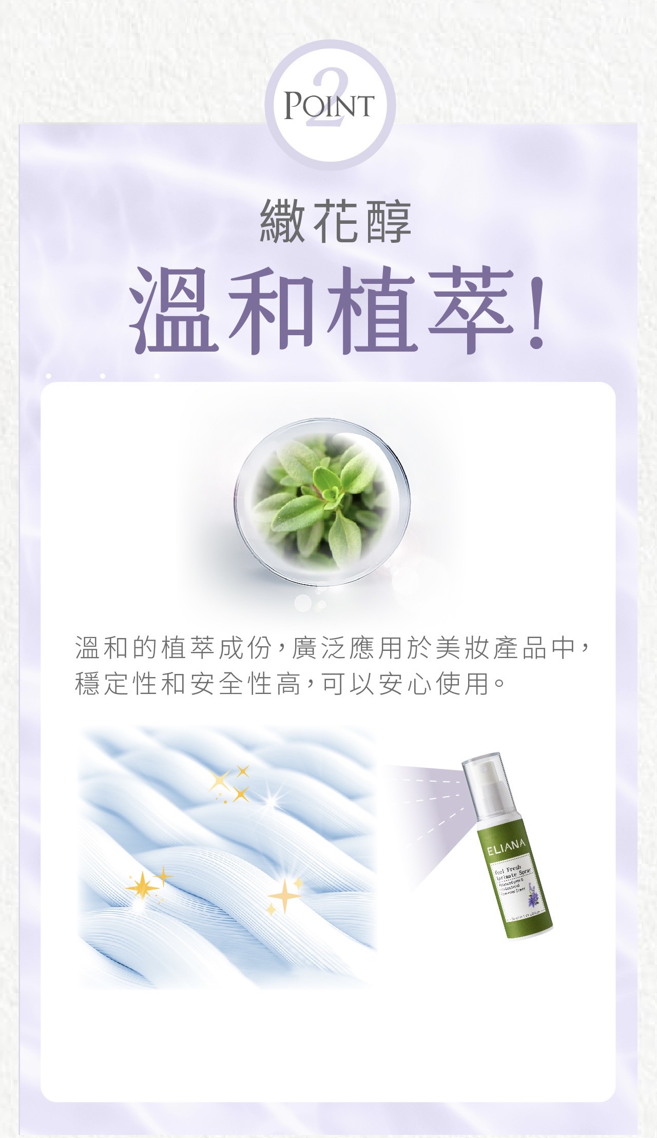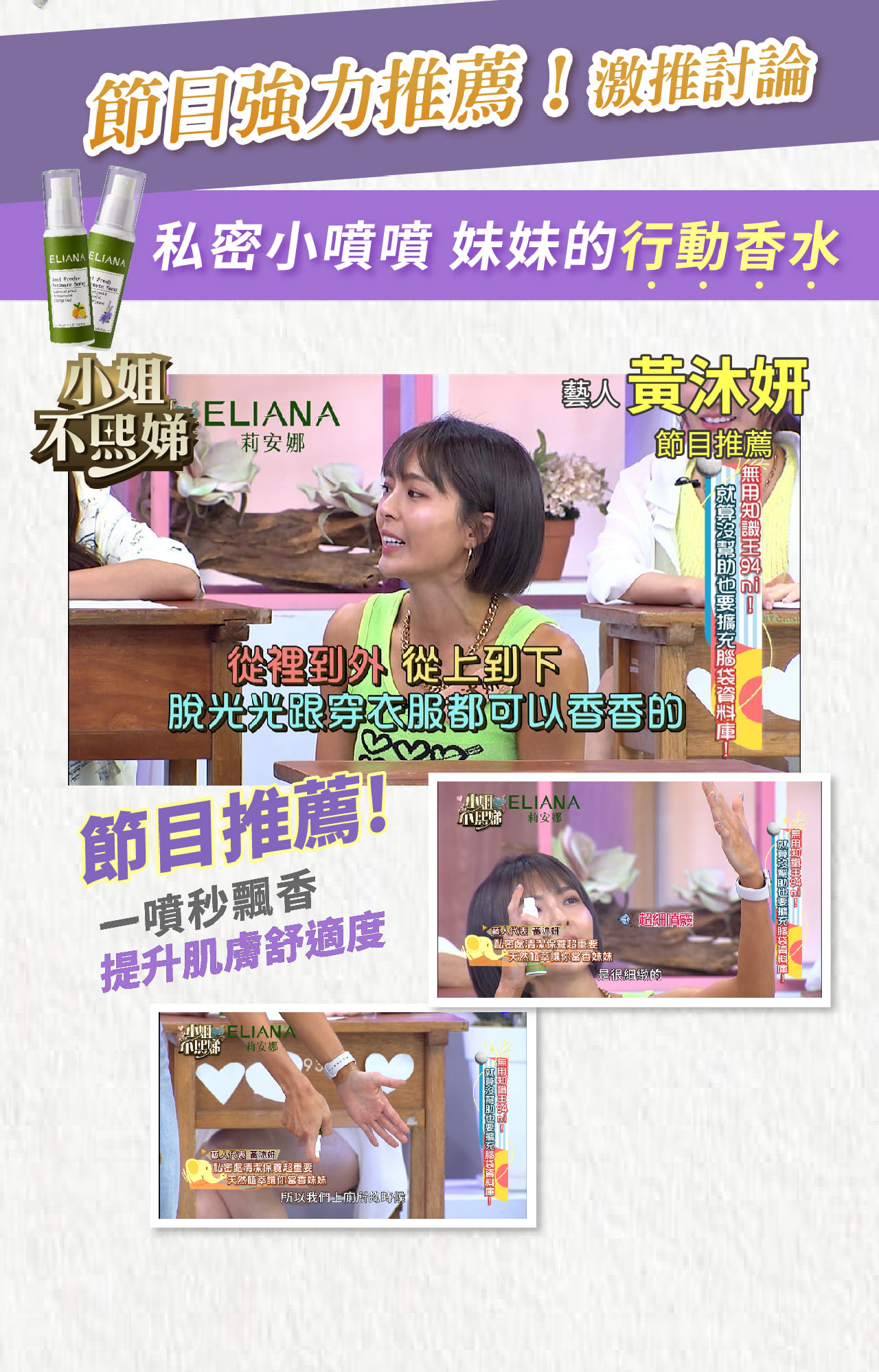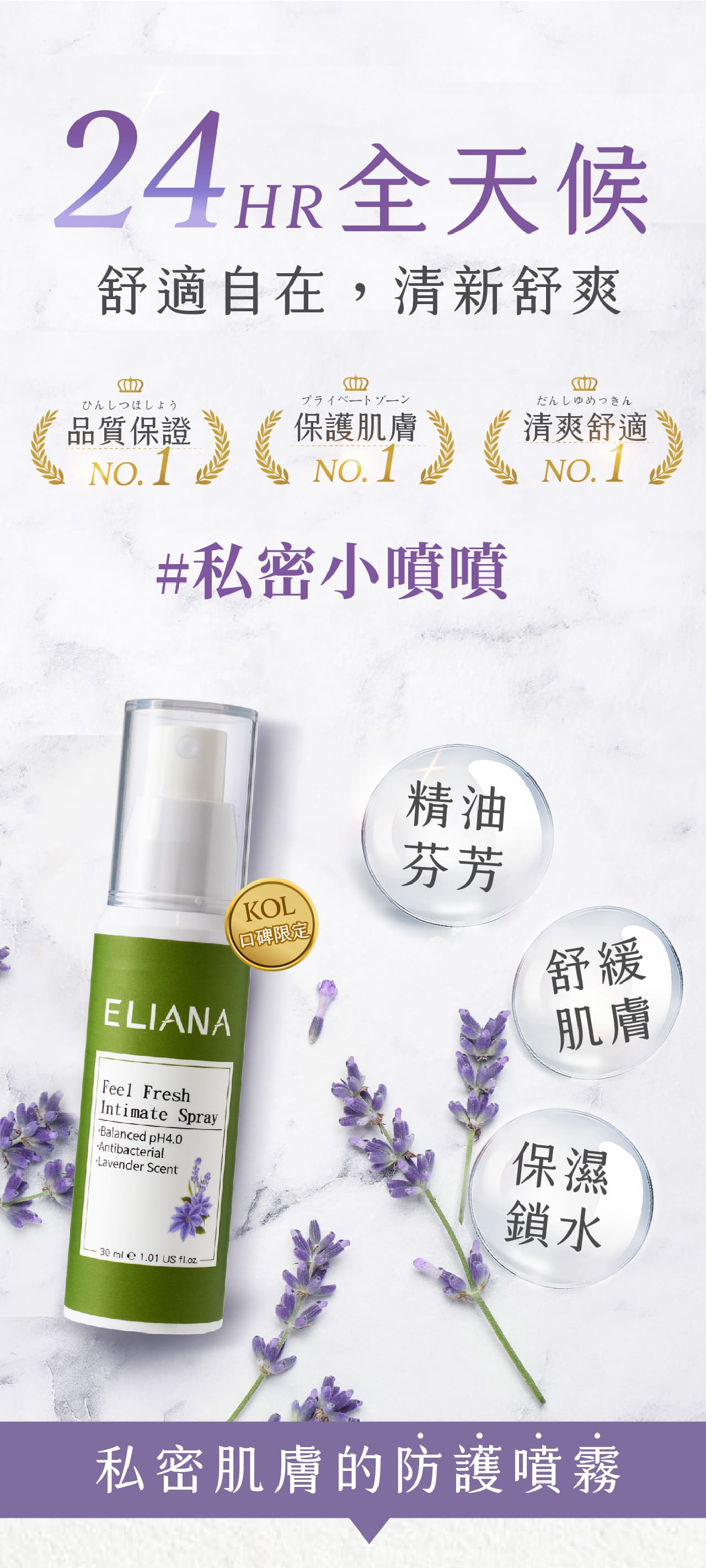 • 「ELIANA 莉安娜私密保養」將植萃精神注入產品,嚴選草本植萃成分,打造出隨身防護私密噴霧系列,使用6種自然植萃成分,並以自然精油調香,拒絕人工香精,無添加安心呵護私密肌。