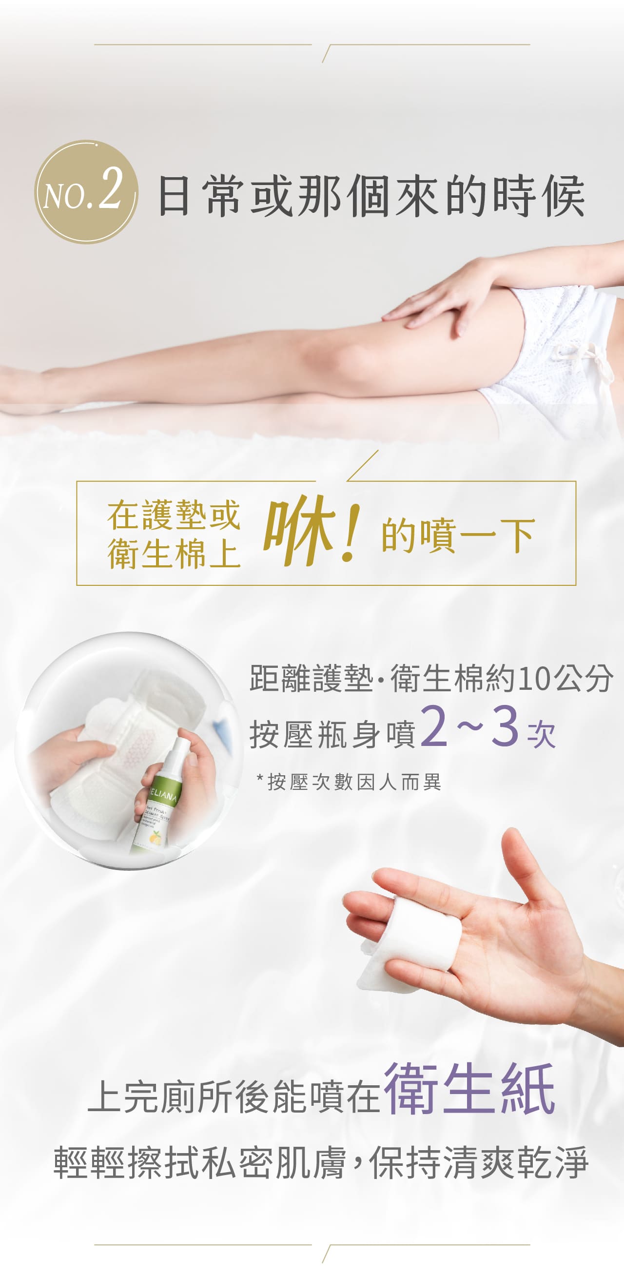 使用方法:於上完廁所後,按壓1~2下輕噴在私密肌後即可穿上內褲,也可噴於護墊、內褲上。