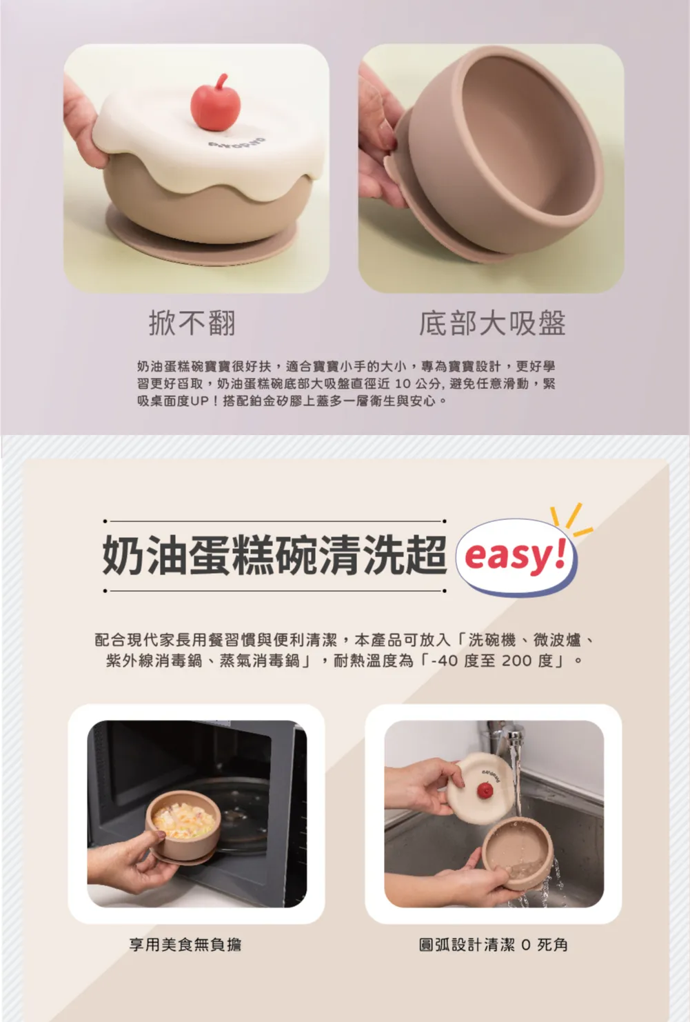 ●配合現代爸媽的用餐習慣與便利清潔工具,本產品可放入「洗碗機、微波爐、紫外線消毒鍋、蒸氣消毒鍋」耐熱溫度為「-40度至200度」