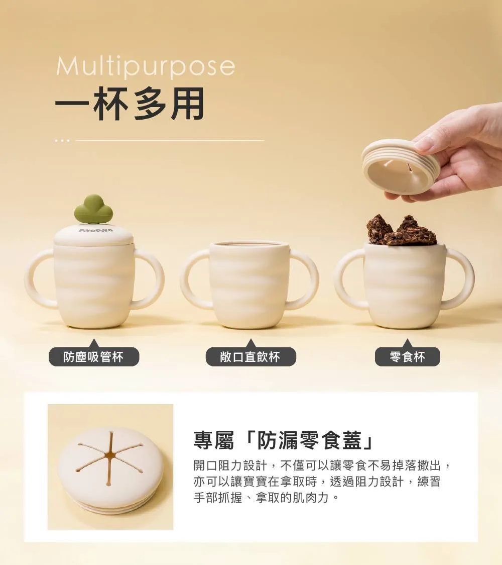 ●一杯多用,附有防塵吸管杯、敞口直飲杯,可變身成零食杯:替換上專屬「防漏零食蓋」——開口阻力設計,不僅可以讓零食不易掉落撒出,亦可以讓寶寶在拿取時,透過阻力設計,練習手部抓握、拿取的肌肉力。