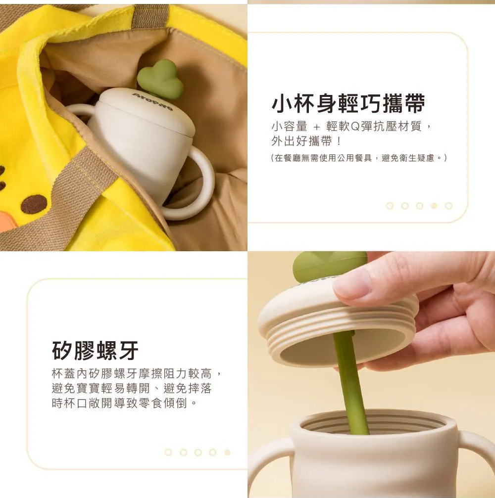 5. 矽膠螺牙摩擦阻力較高,避免寶寶輕易轉開、避免摔落時杯口敞開導致零食傾倒。