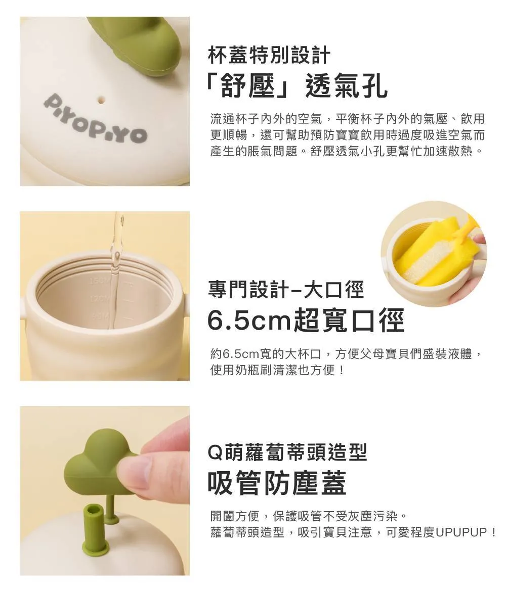杯蓋特別設計「舒壓」透氣孔,可流通杯子內外的空氣,平衡杯子內外的氣壓、飲用更順暢,可幫助預防寶寶飲用時過度吸進空氣而產生的脹氣問題。且可幫助加速散熱。