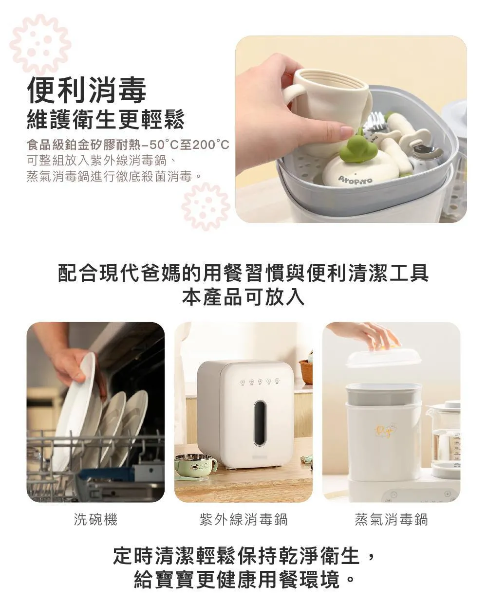 ●配合現代爸媽的用餐習慣與便利清潔工具,本產品可放入「洗碗機、微波爐、紫外線消毒鍋、蒸氣消毒鍋」耐熱溫度為「-40度至200度」