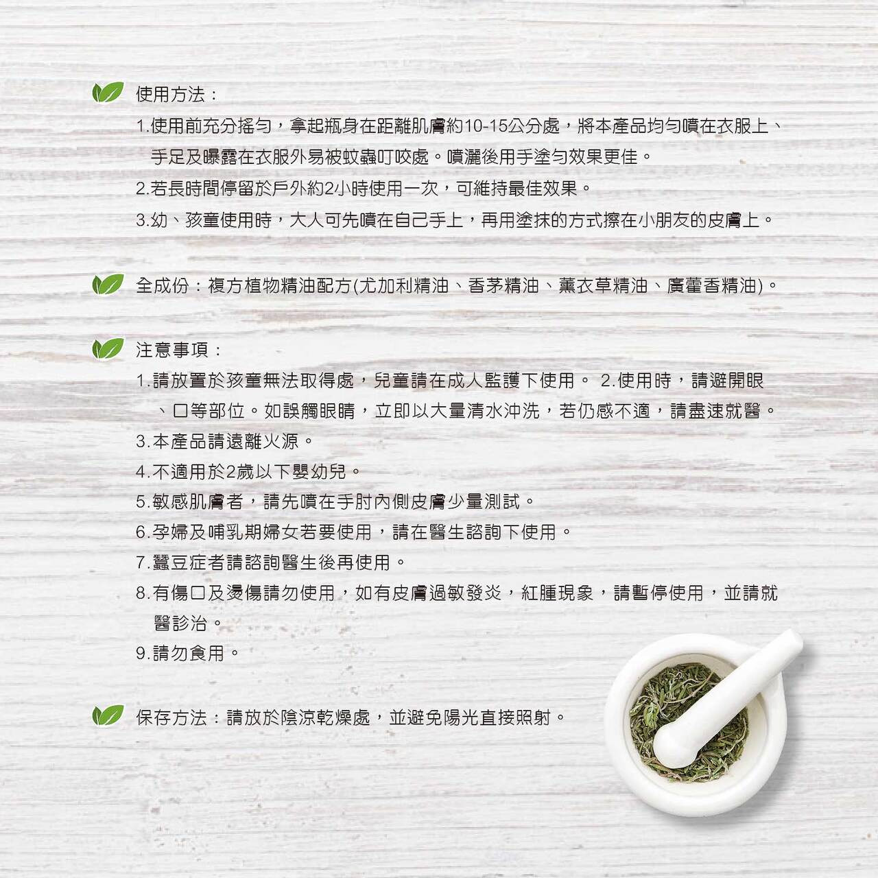 ● 不含化學成份DEET(敵避)、無毒性,清爽不黏膩,不會沾污衣服,溫和不刺激,適合全家,小孩也可安心使用。