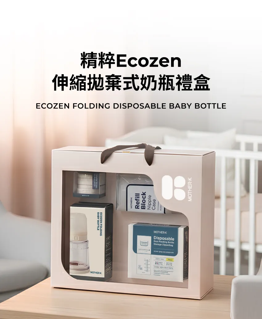 禮盒內容物:1. 精粹Ecozen伸縮拋棄式奶瓶(無附奶嘴頭)2. 精粹極簡奶嘴環2入3. 積木式奶嘴收納盒4. 溫感雙鎖拋棄式奶瓶袋 25入(雙夾鏈)