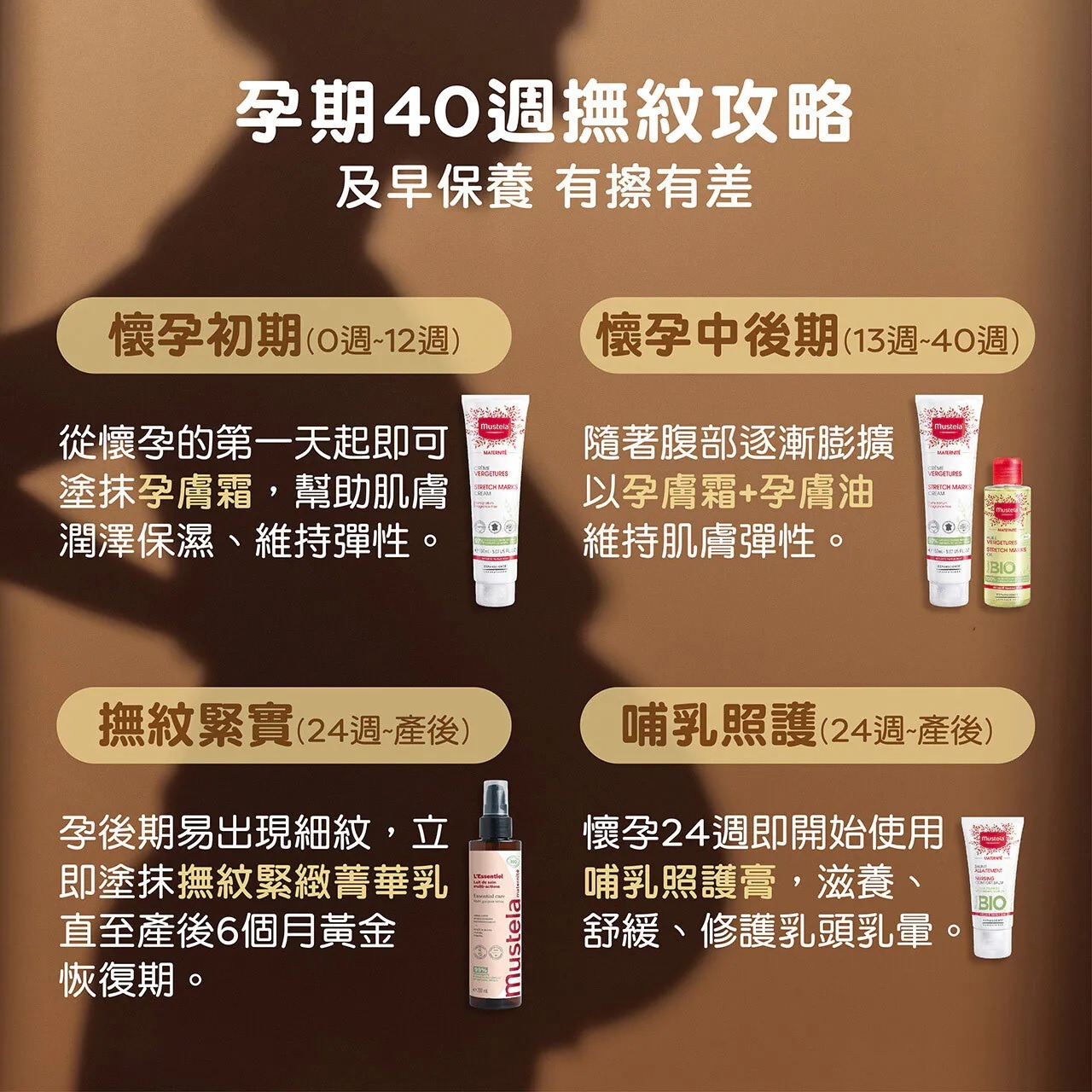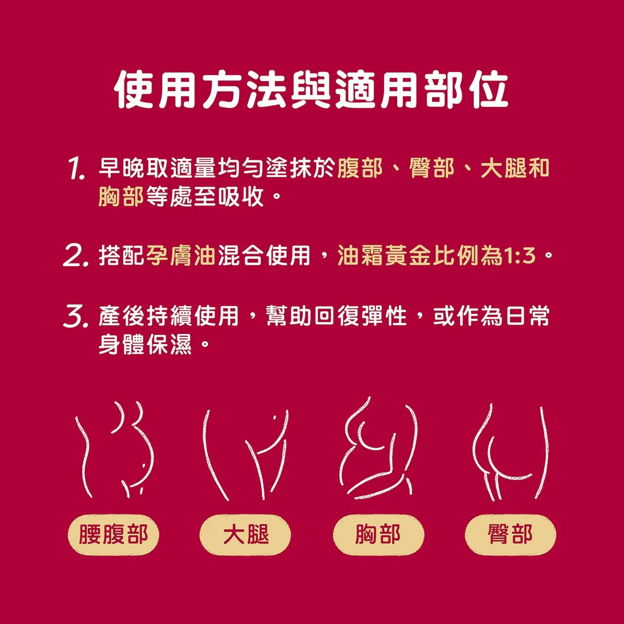 建議可搭配「孕膚油」:日擦「孕膚霜」夜抹「孕膚油」或黃金比例1:3混合使用 雙重精華層層防護