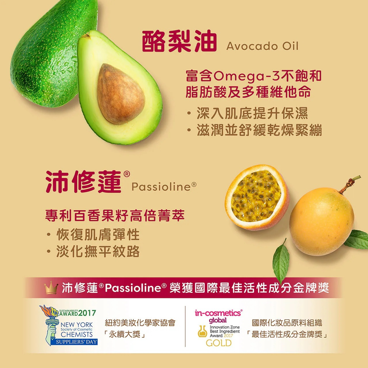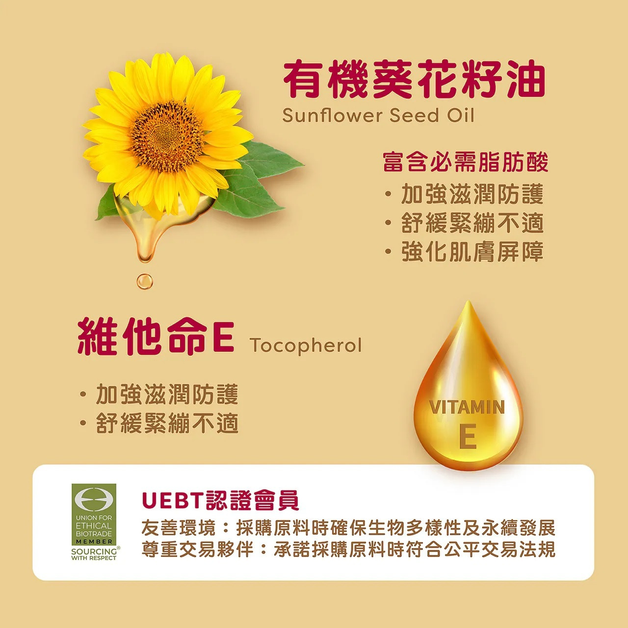 含6大植萃油搭配維他命E抗老,滑順好吸收