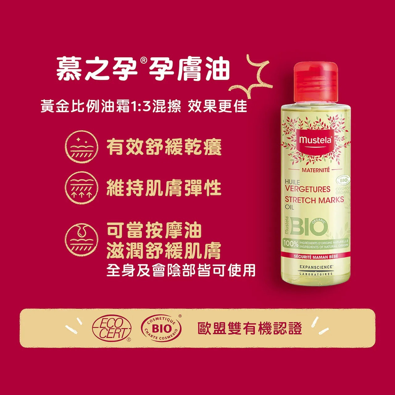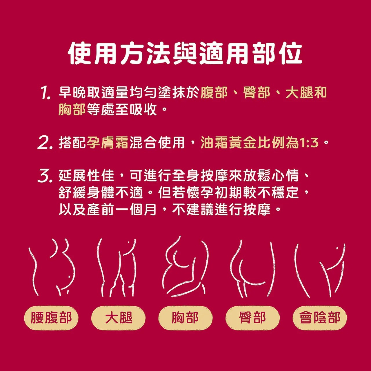 建議可搭配「孕膚霜」:日擦「孕膚霜」夜抹「孕膚油」或黃金比例1:3混合使用 雙重精華層層防護
