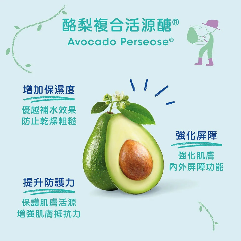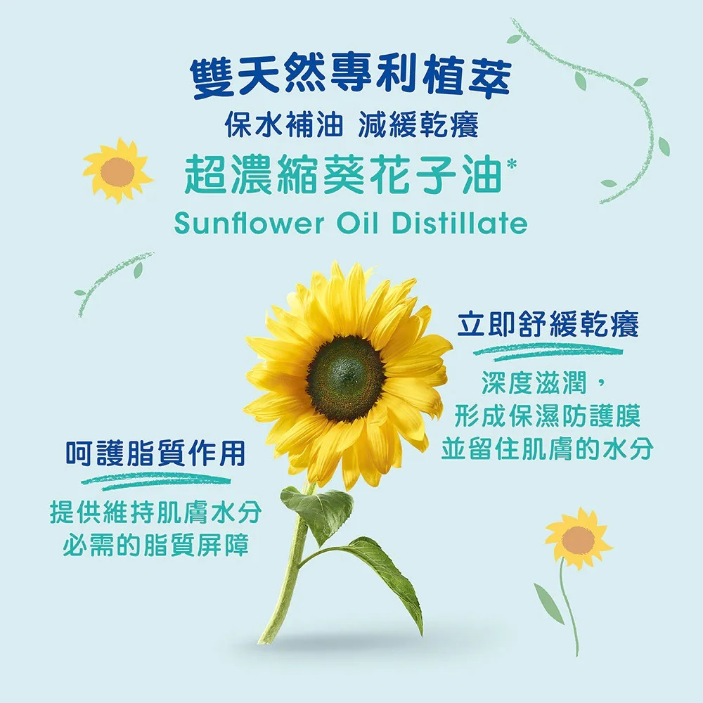 超濃縮葵花子油+酪梨複合活源醣,兩大專利成份,泡澡肌膚滋潤強化打底
