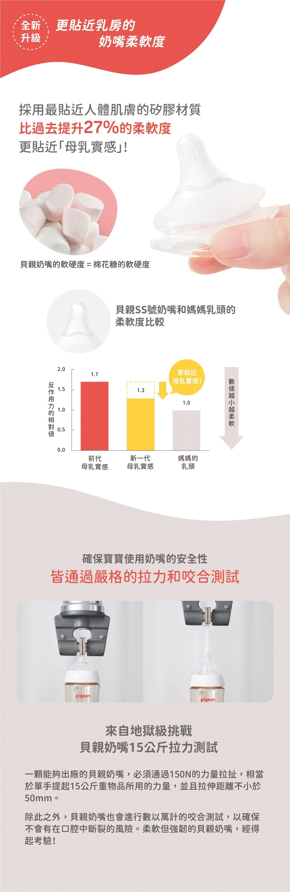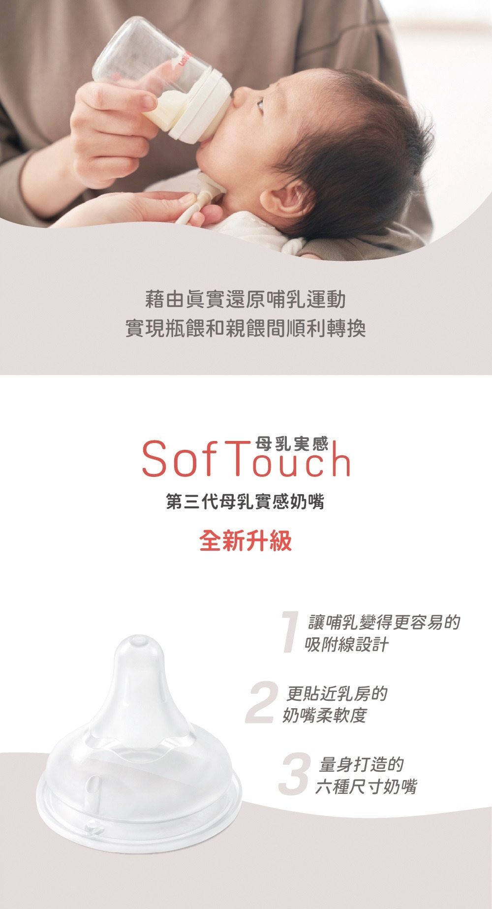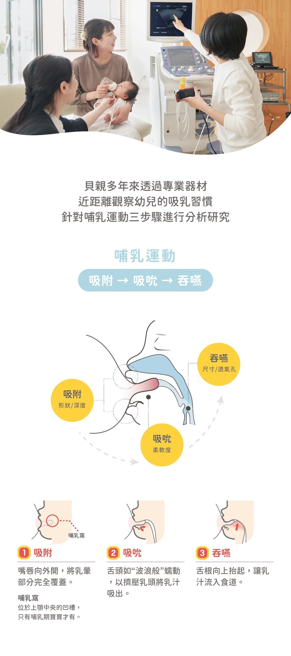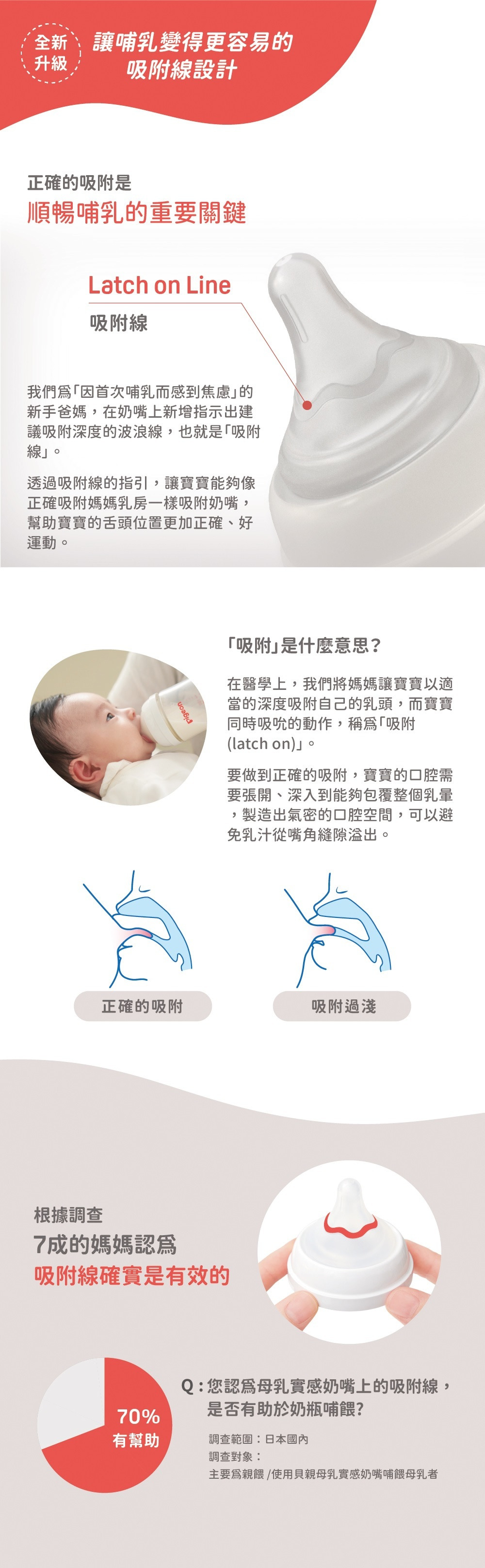 形狀能促進寶寶自然正確的吸附:口徑寬、乳暈部分的形狀很簡潔,能順利以嘴巴含住,促進嘴唇的吸附功能。
