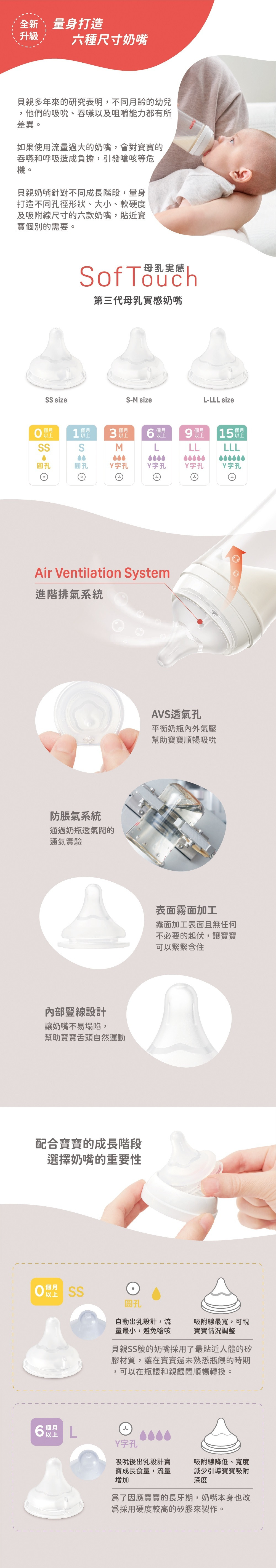 隨寶寶的成長選擇孔徑大小:不流出超過所需量的乳汁,讓寶寶輕鬆地慢慢飲用。