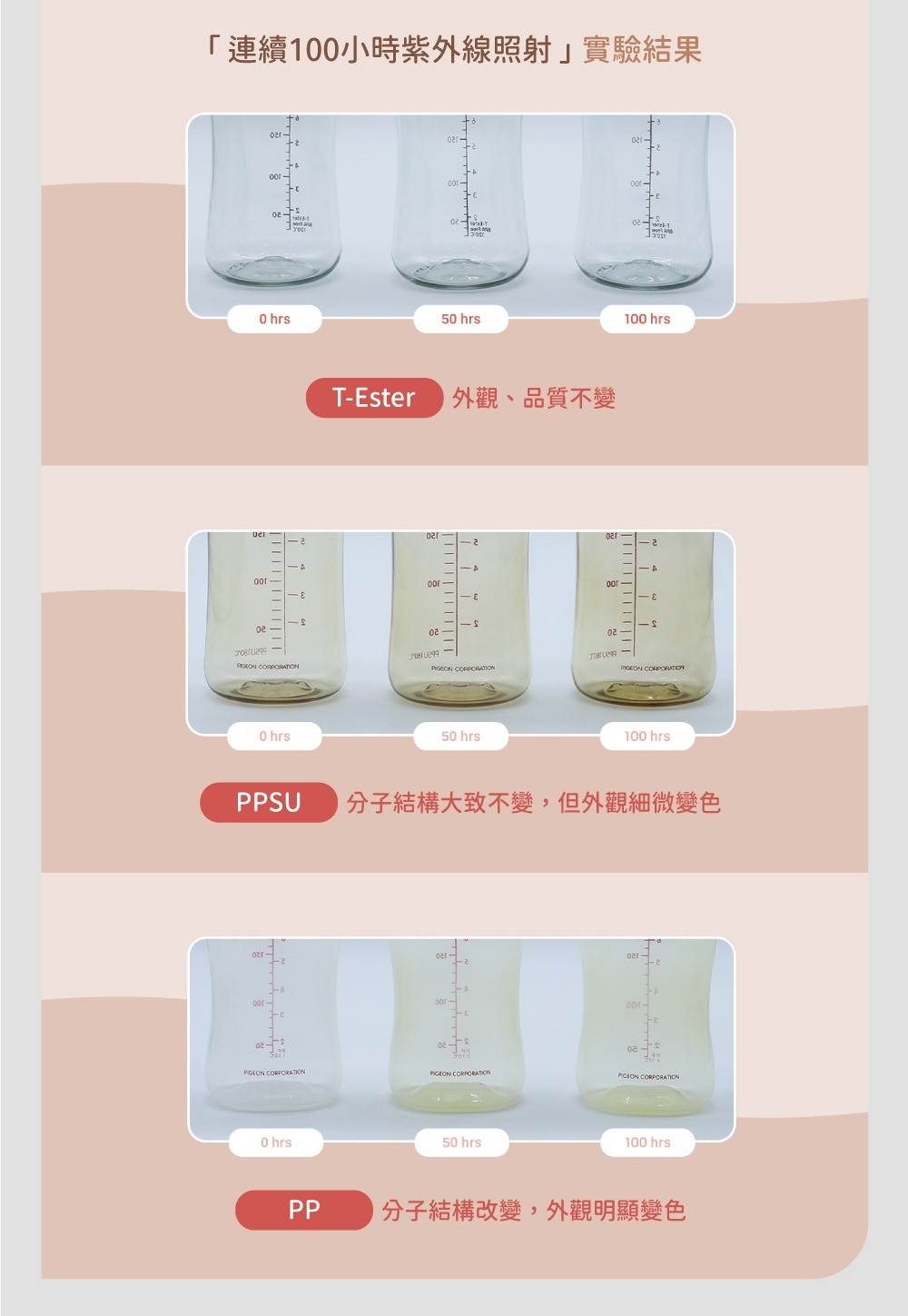 耐溫耐消毒:優異的耐熱性及耐藥性,亦可承受紫外線消毒,實驗證實,連續100小時紫外線照射仍可維持外觀及品質不變