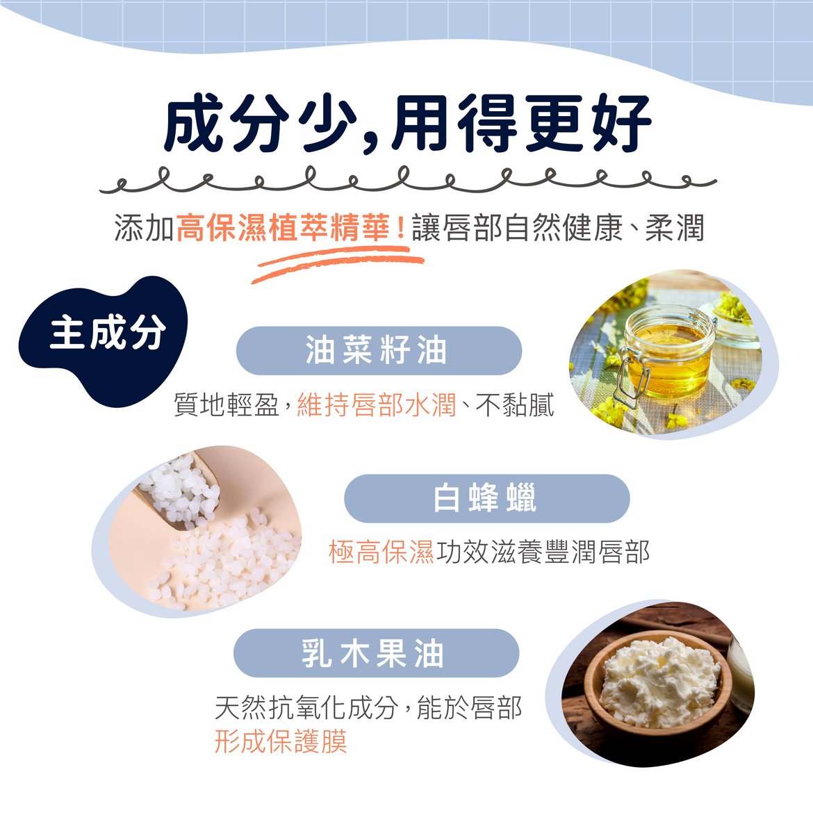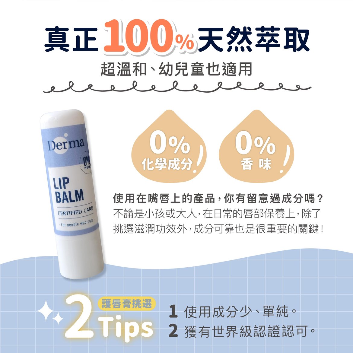 100% 源自天然無香味配方,更通過國際低敏認證,以單純、溫和的植萃成分滋潤雙唇