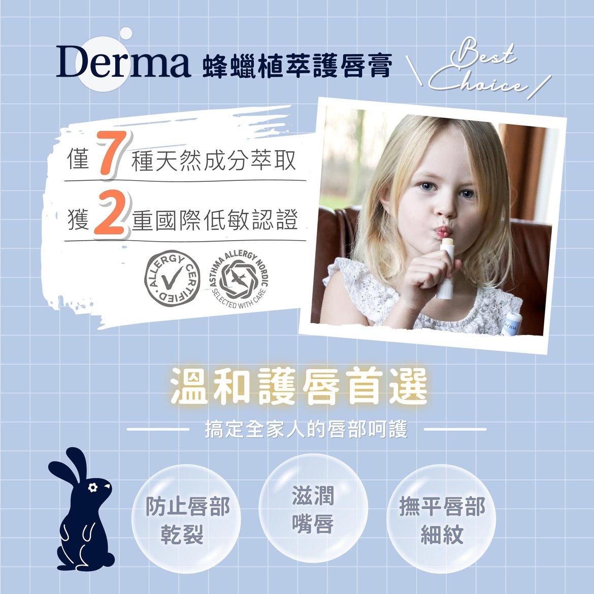 100%天然植萃成分深層滋潤雙唇,恢復柔嫩彈性。無香精、無Parabens防腐劑、無酒精,給全家人最溫和的呵護。