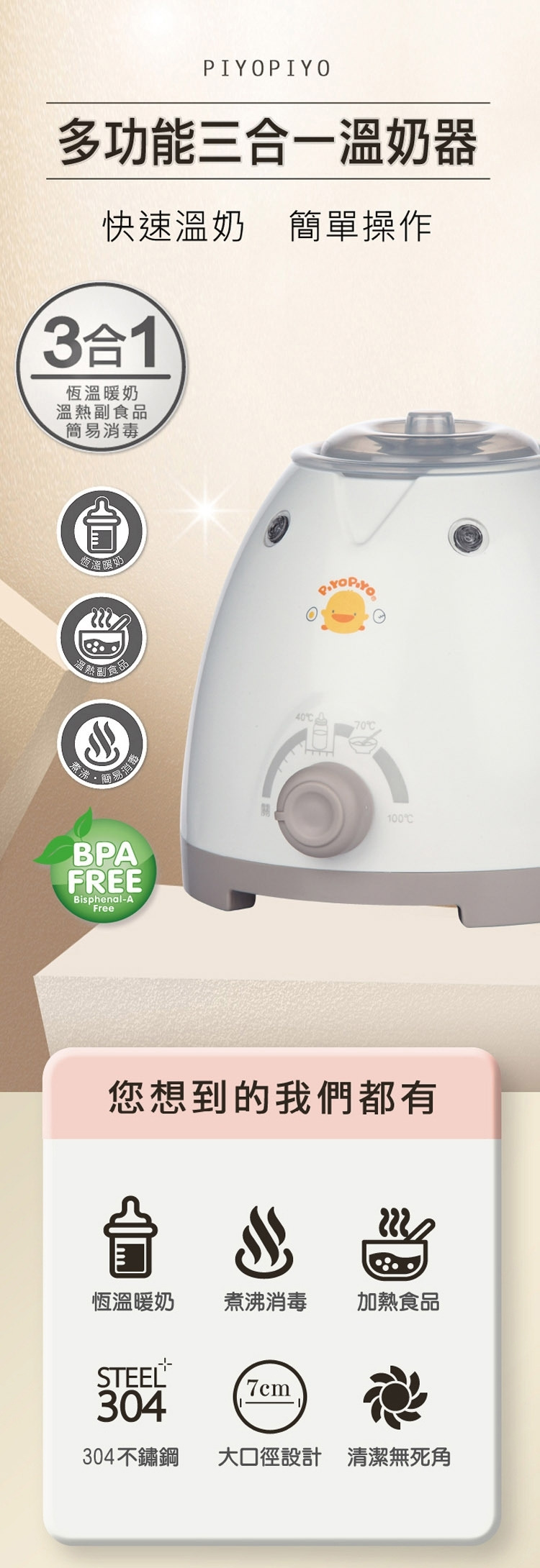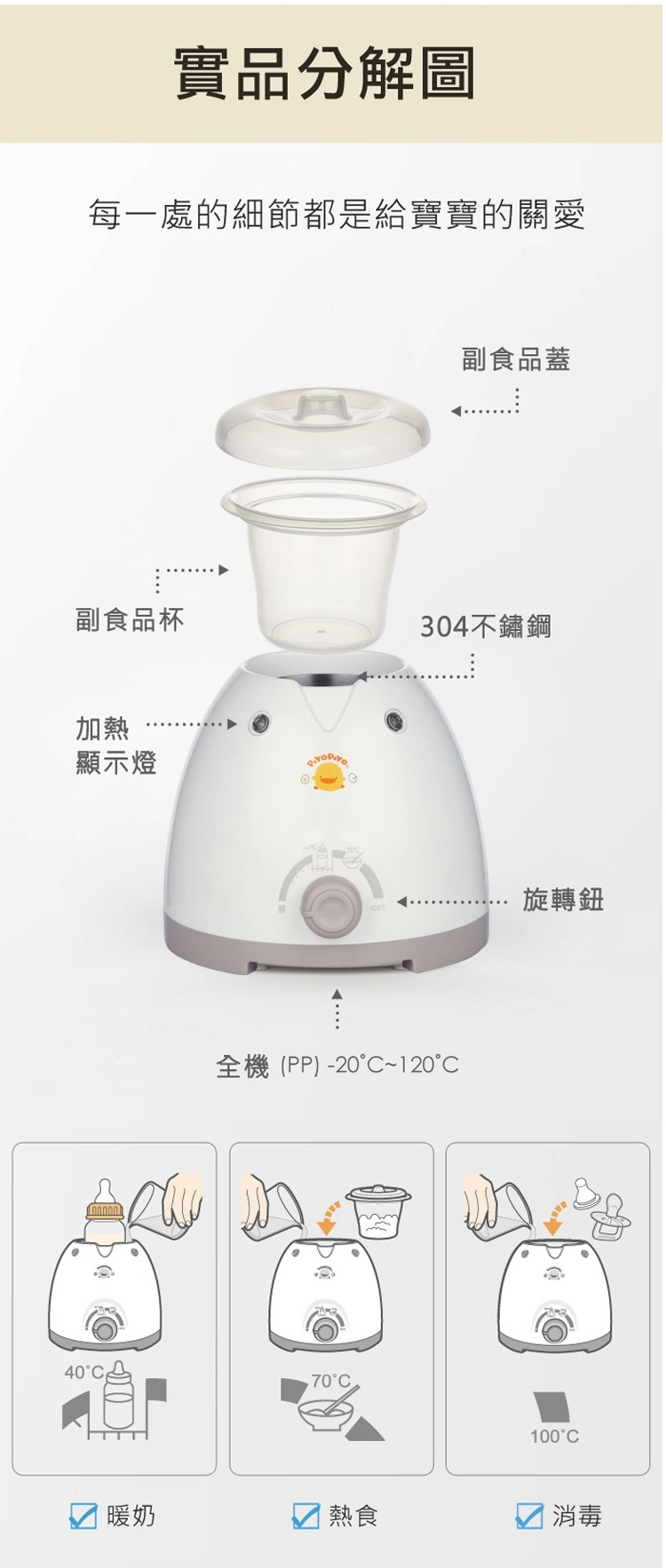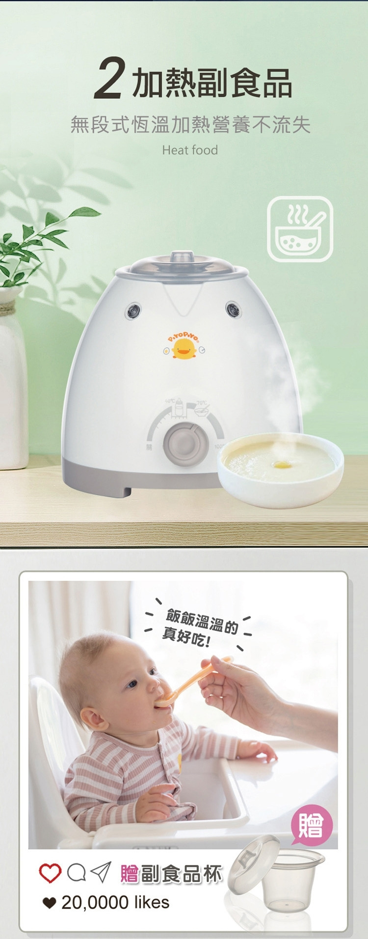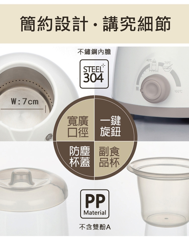 ●可調乳及加熱寶寶副食品,使用多數標準,寬口的奶瓶或集乳袋,並附贈食品杯。