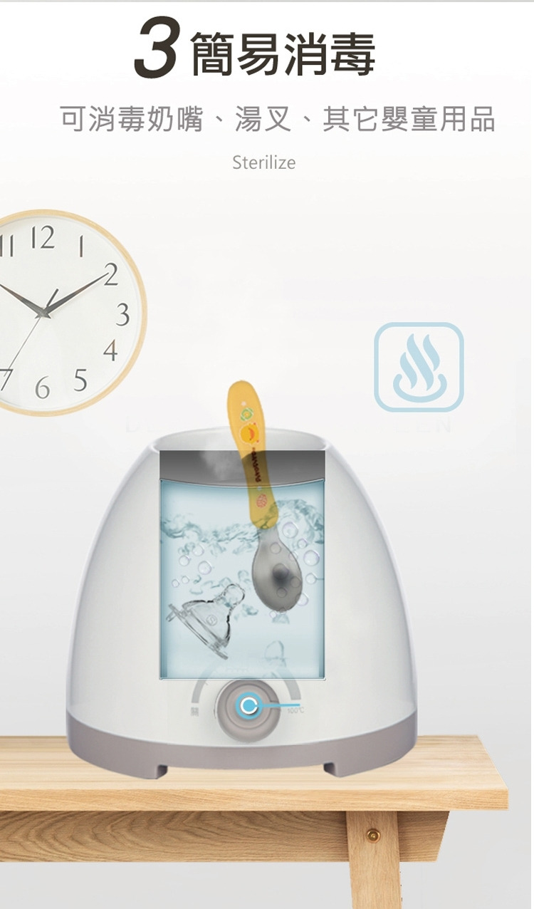 煮沸、簡易消毒:先倒入約8分滿適量清水。接通電源,旋轉至100?C符號,紅燈亮,進入加熱狀態。待水加熱後,將小物件放溫奶器內進行消毒。