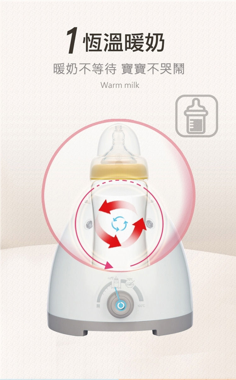 暖奶:放入奶瓶,再倒入約8分滿清水至溫奶器內。接通電源,旋轉至奶瓶圖示,紅燈亮,進入加熱狀態。